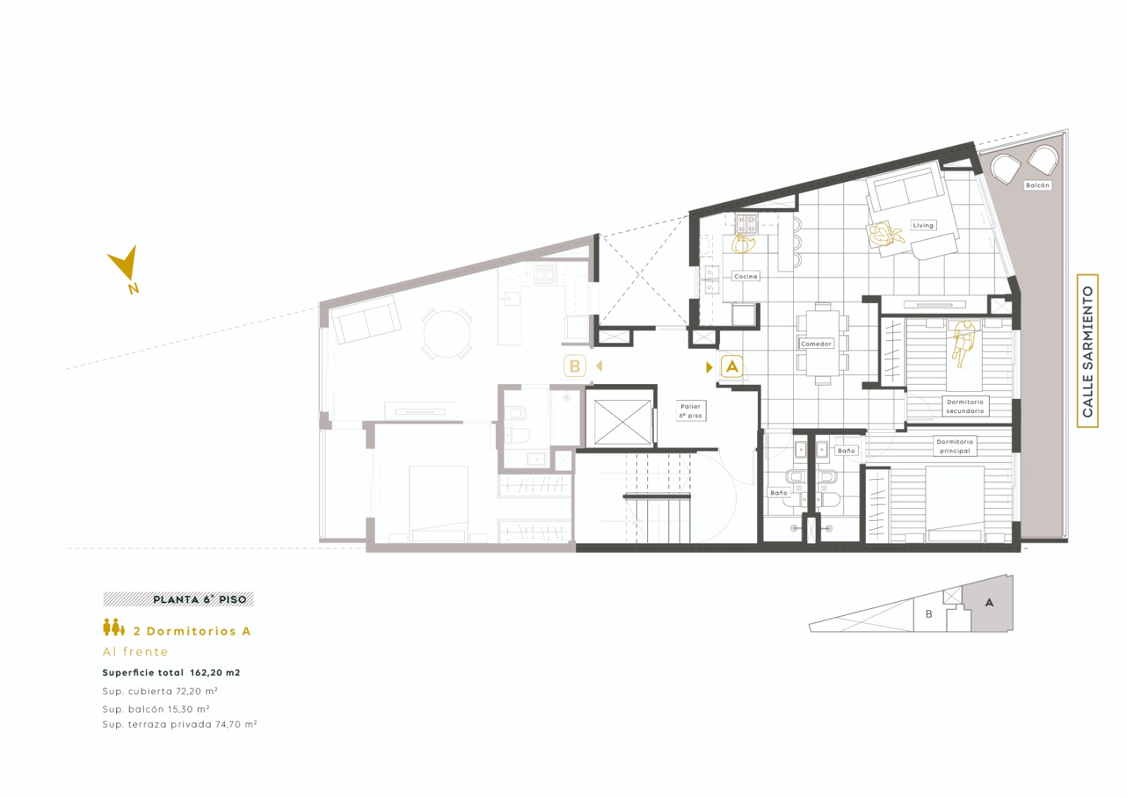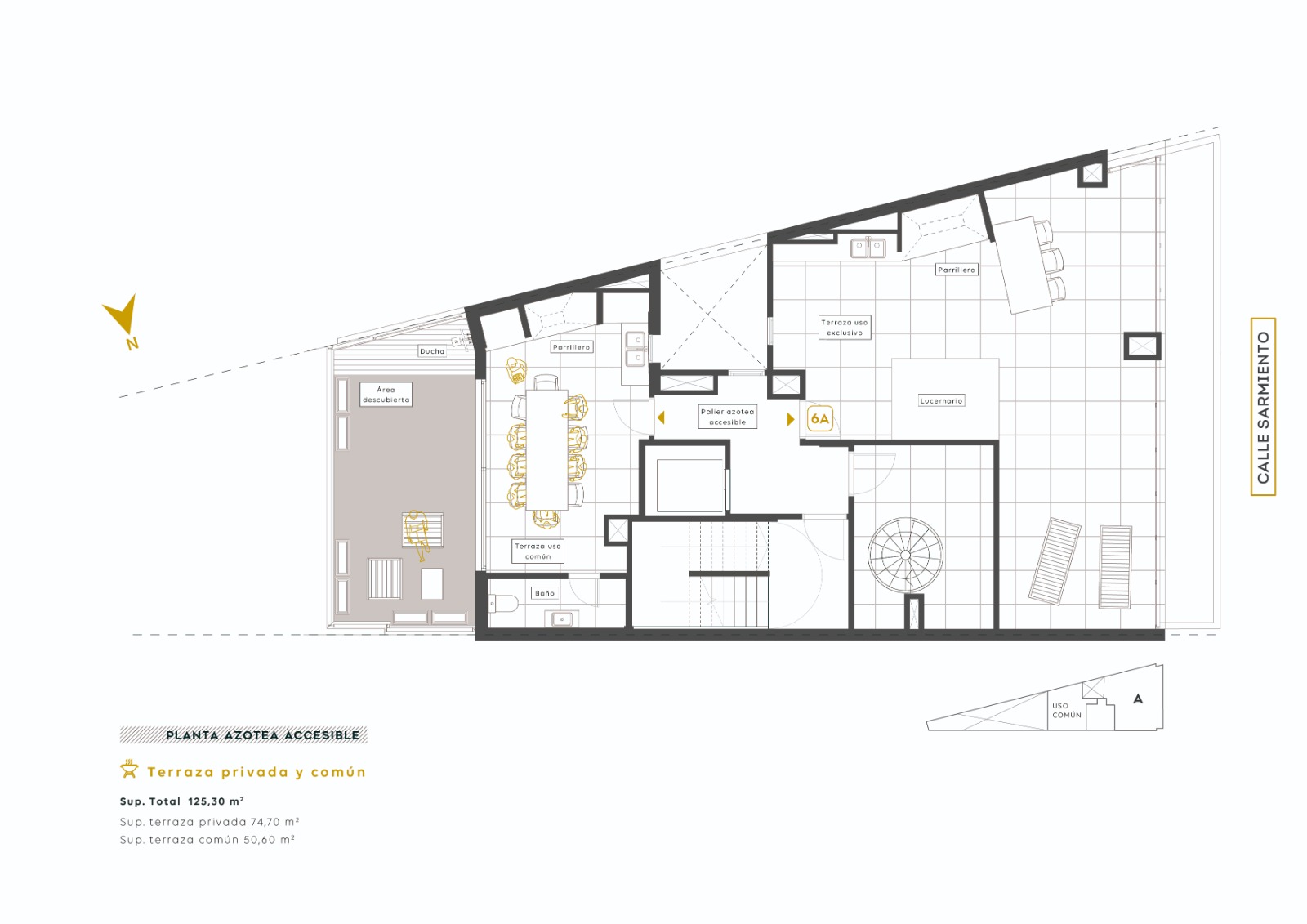 Superficie piso 6: total de 16 mts. (72,17 mts. exlcusivos + 15,14 mts. de balcón + 74,73 mts. de terraza propia).