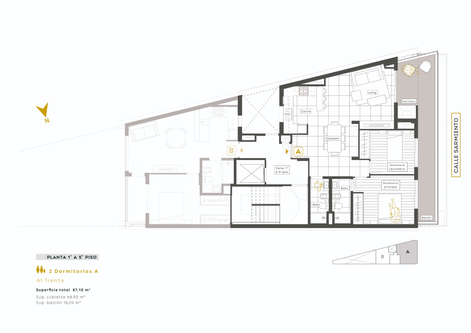 Departamentos de 2 dormitorios: orientados al Oeste. Estar - comedor con cocina semi integrada por barra desayunadora, dos dormitorios (el principal en suite) y segundo baño completo. Balcón corrido con parillero propio (pisos 1 al 5). Opción piso 6 con terraza propia en azotea. Superficie total: 87,30 mts. (69,66 mts. exclusivos + 17,64 mts. de balcón).