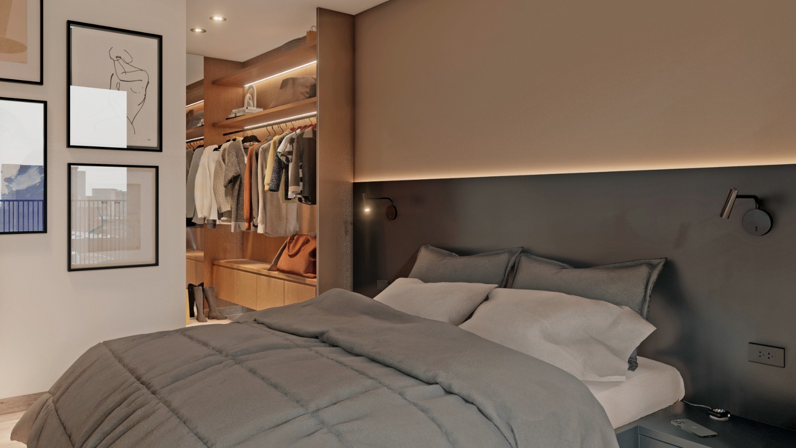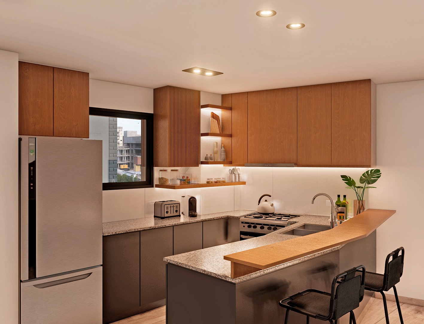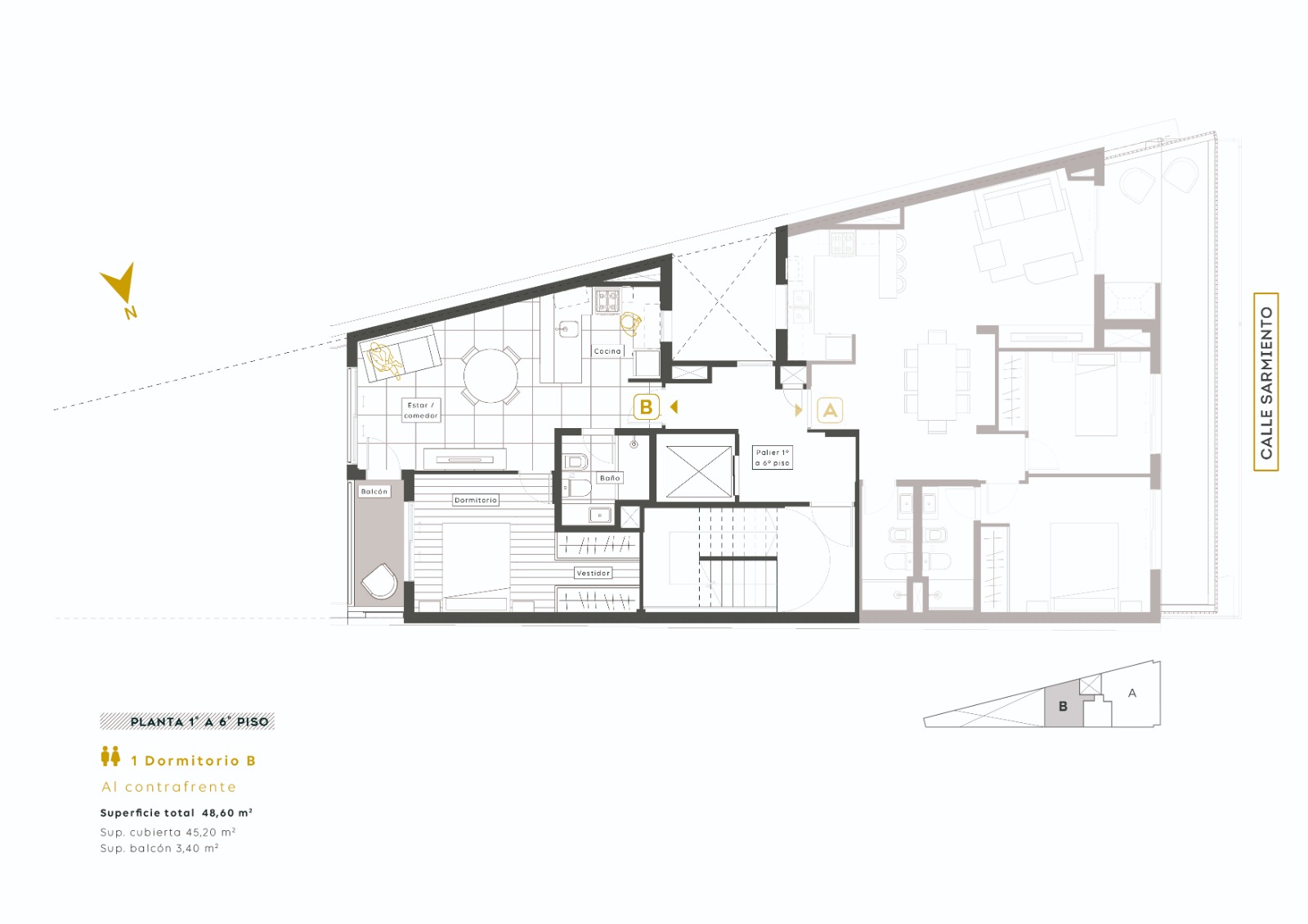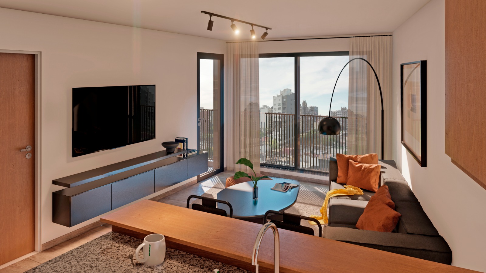 Departamentos de 1 dormitorio: orientados al Este. Estar - comedor con cocina semi integrada por barra desayunadora, dormitorio con vestidor y baño completo. Acceso al balcón desde el estar - comedor y dormitorio. Superficie total (aproximada): 49,02 mts. (45,18 mts. exclusivos + 3,84 mts. de balcón).