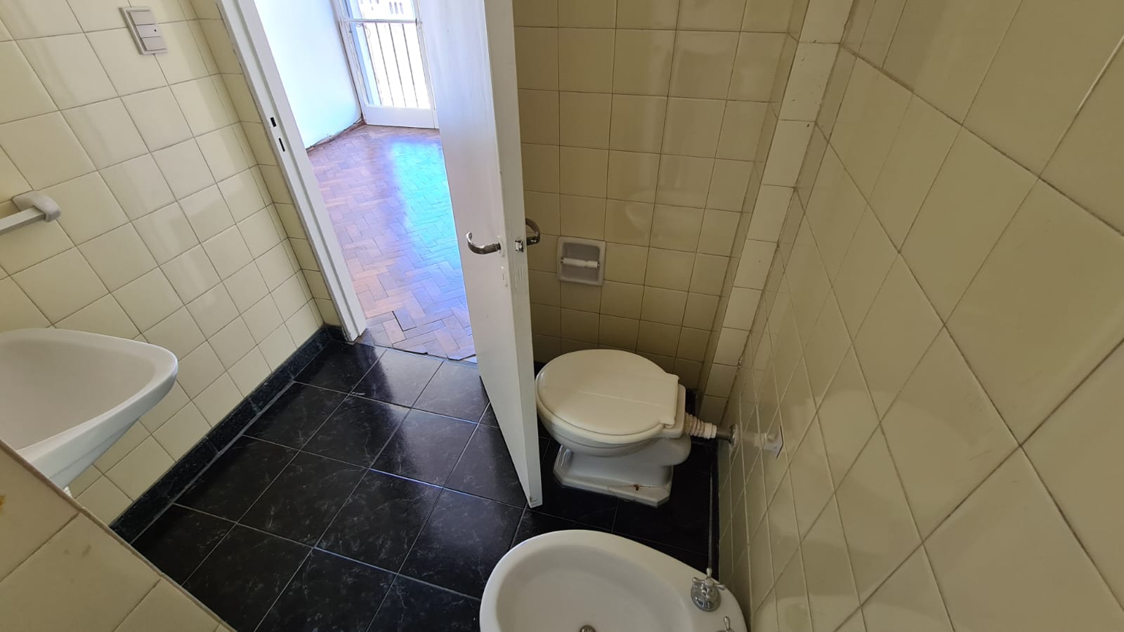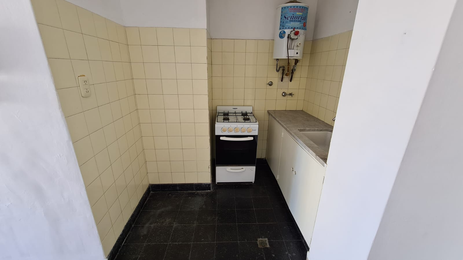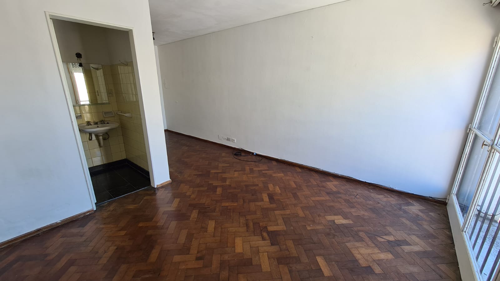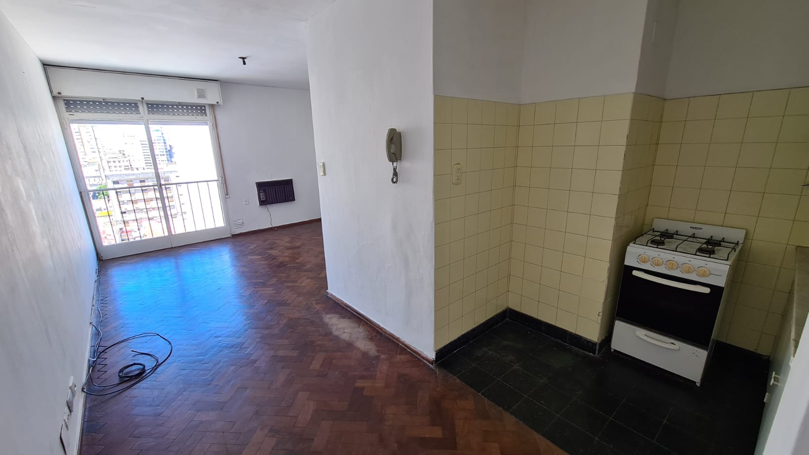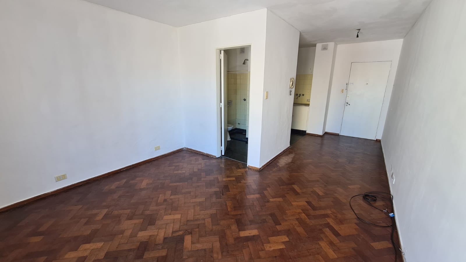 Ambiente único externo (sin balcón) orientado al este, cocina levemente sectorizada del espacio social y baño con habitáculo.