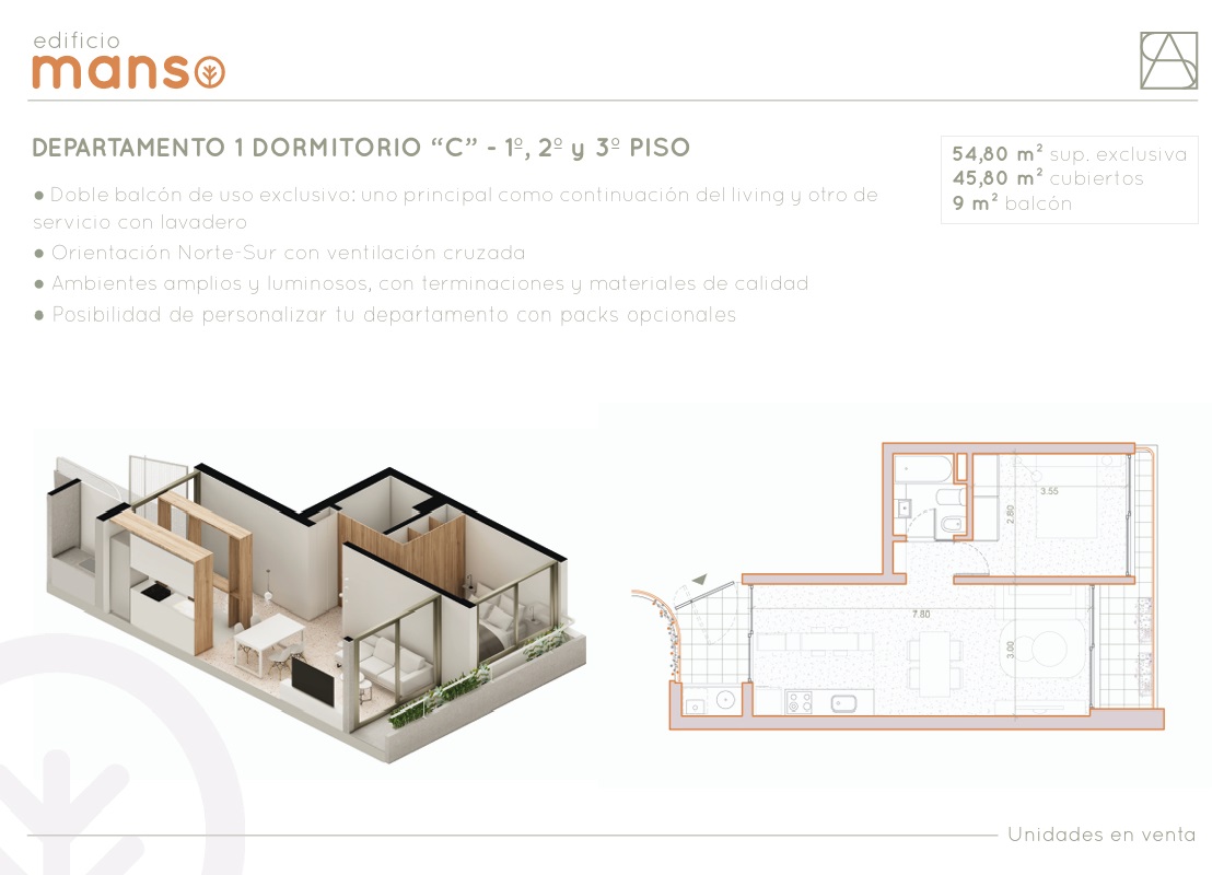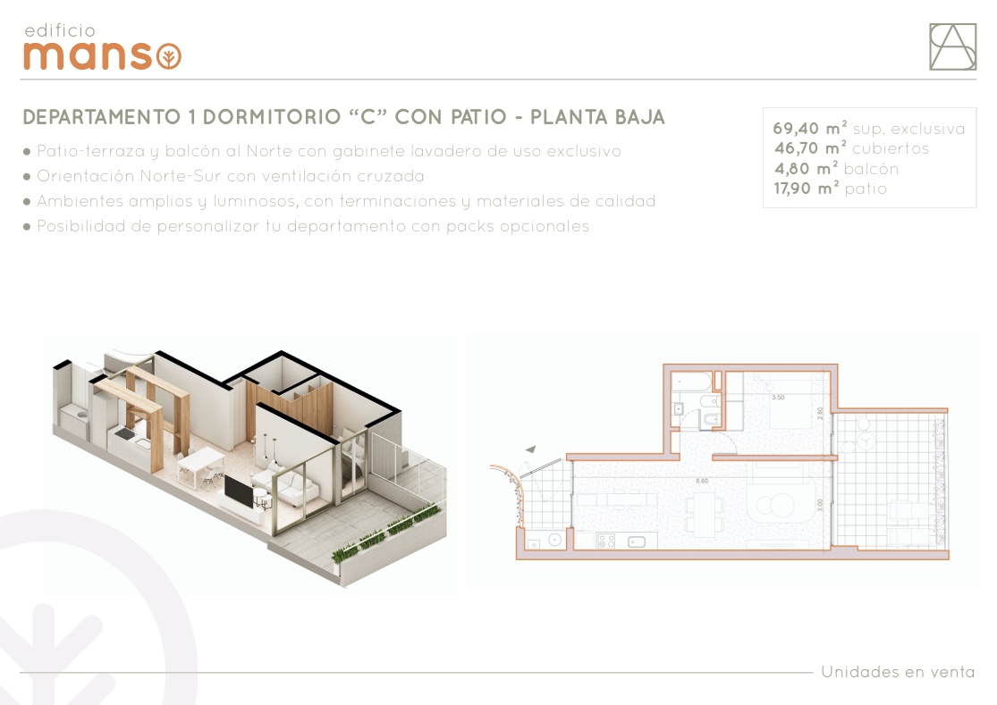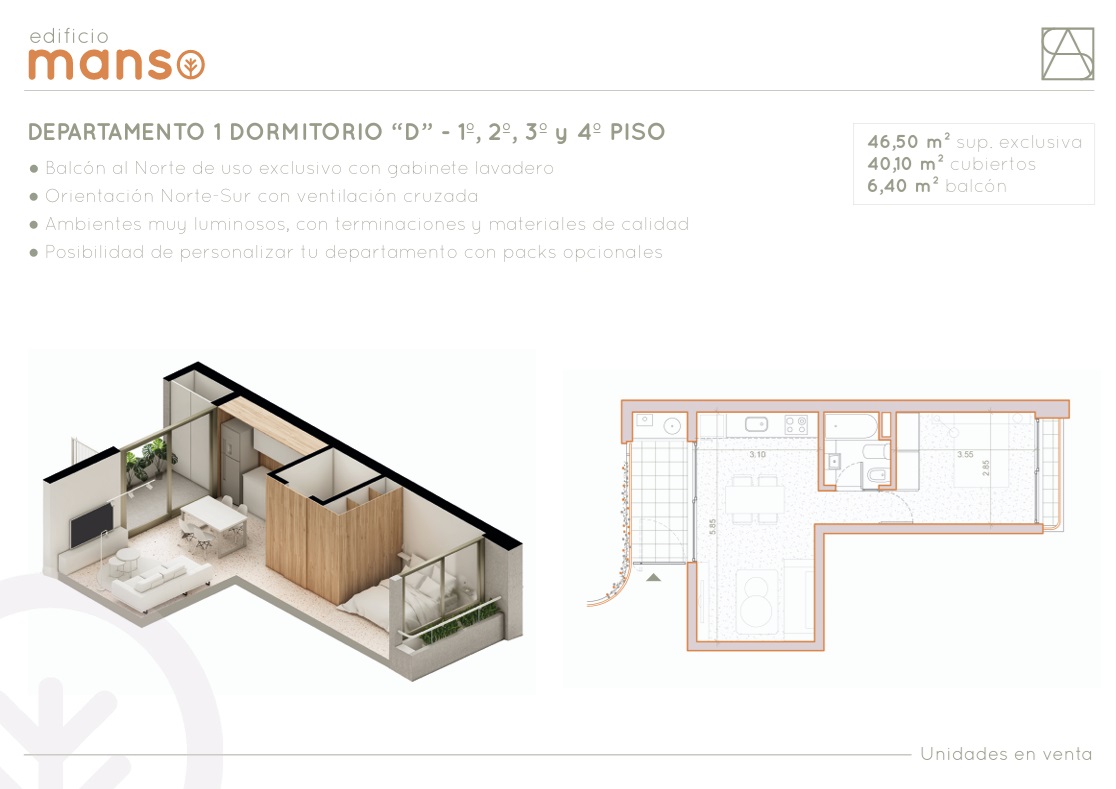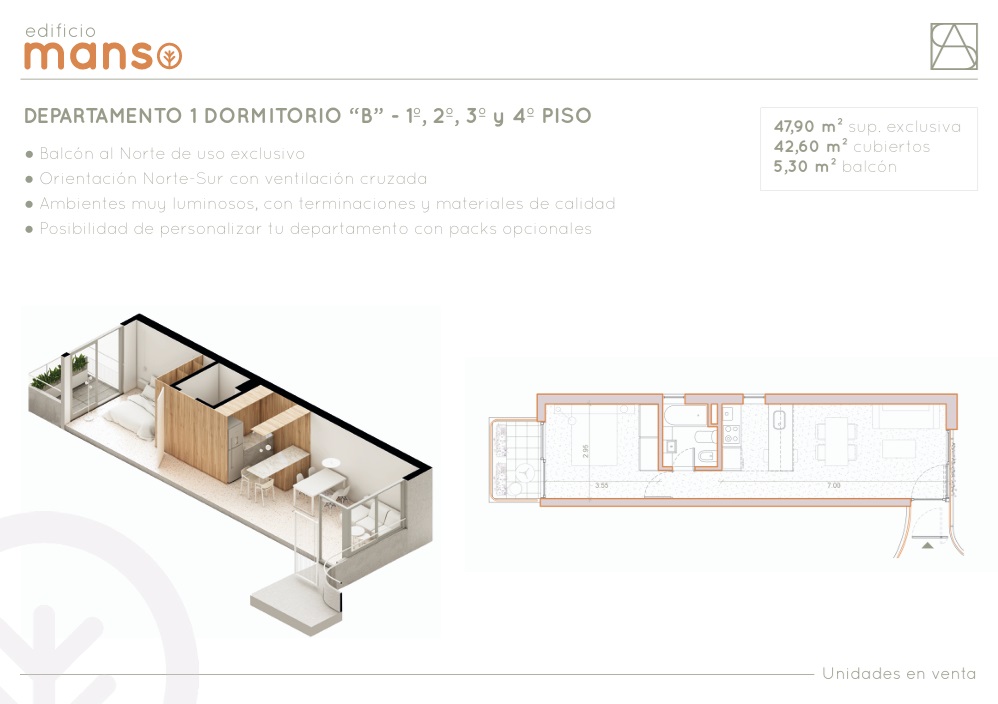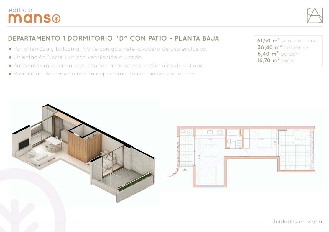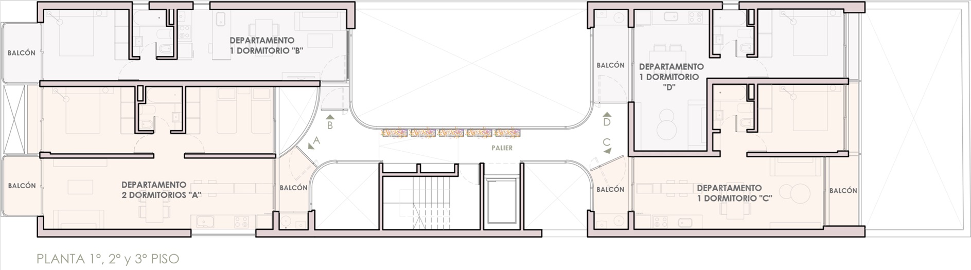 Departamentos de 1 dormitorio con distintas tipologías, orientaciones y superficies. Posibilidad con patio en PB o con terraza propia en el piso 4.