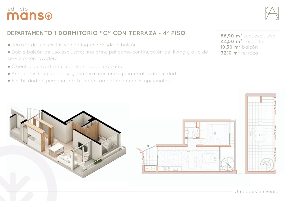 Unica unidad de 3 dormitorios con terraza propia (desde el departamento) en piso 4. Se compone por estar - comedor, dormitorio principal en suite con vestidor, dos dormitorios, segundo baño completo y toilette de recepción. Superficie: 217,50 mts. (117,90 mts. cubiertos + 20,80 mts. de balcones + 78,80 mts. de terraza).