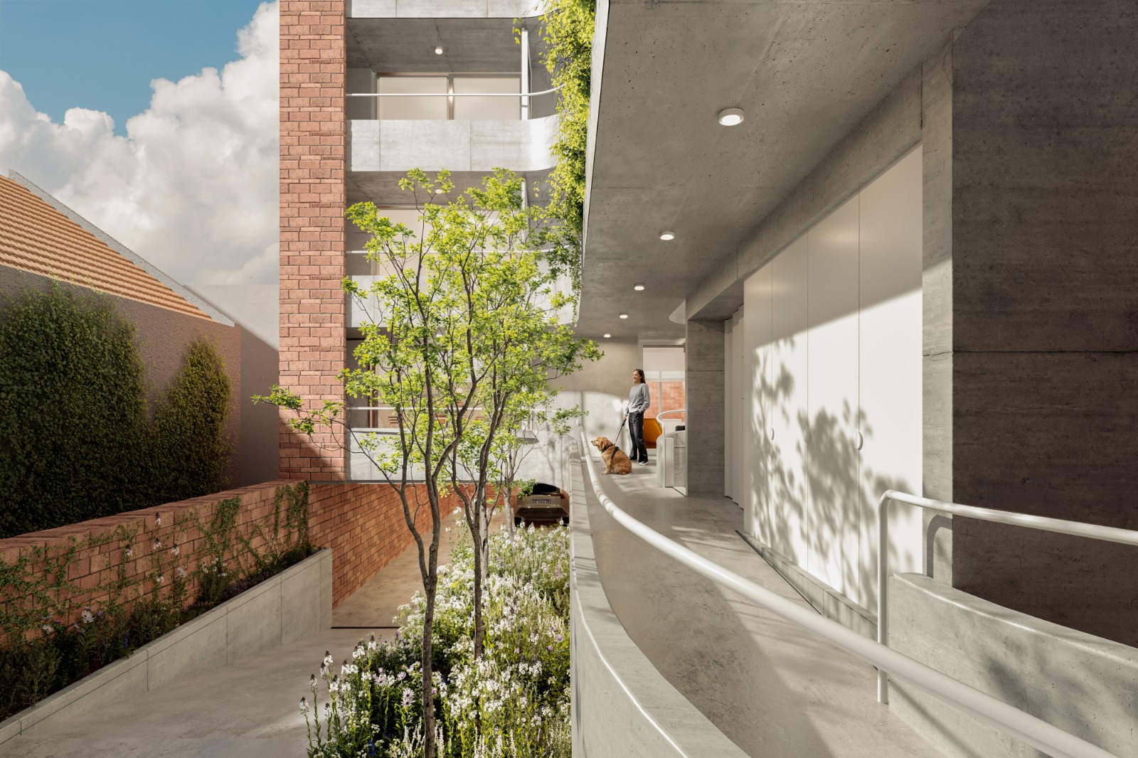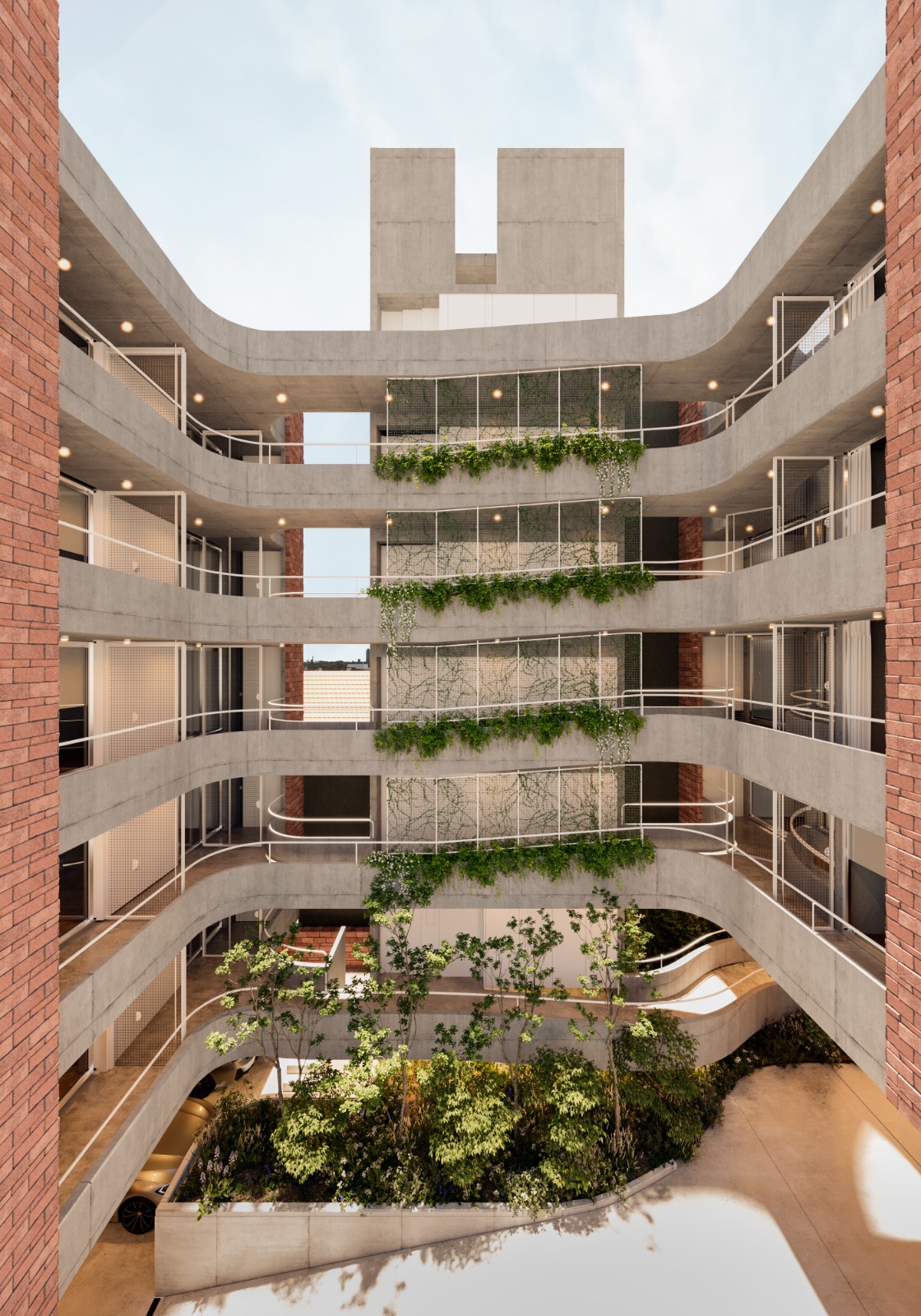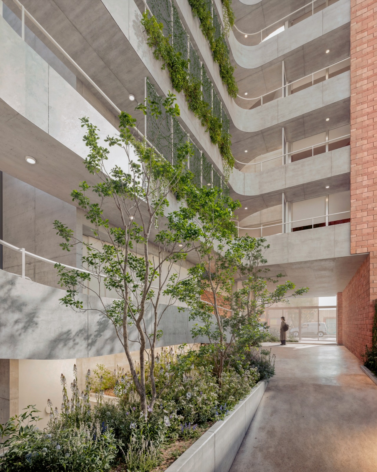 Los palieres de acceso a los departamentos son diseñados como pasarelas abiertas al patio central y poseen canteros con vegetación.