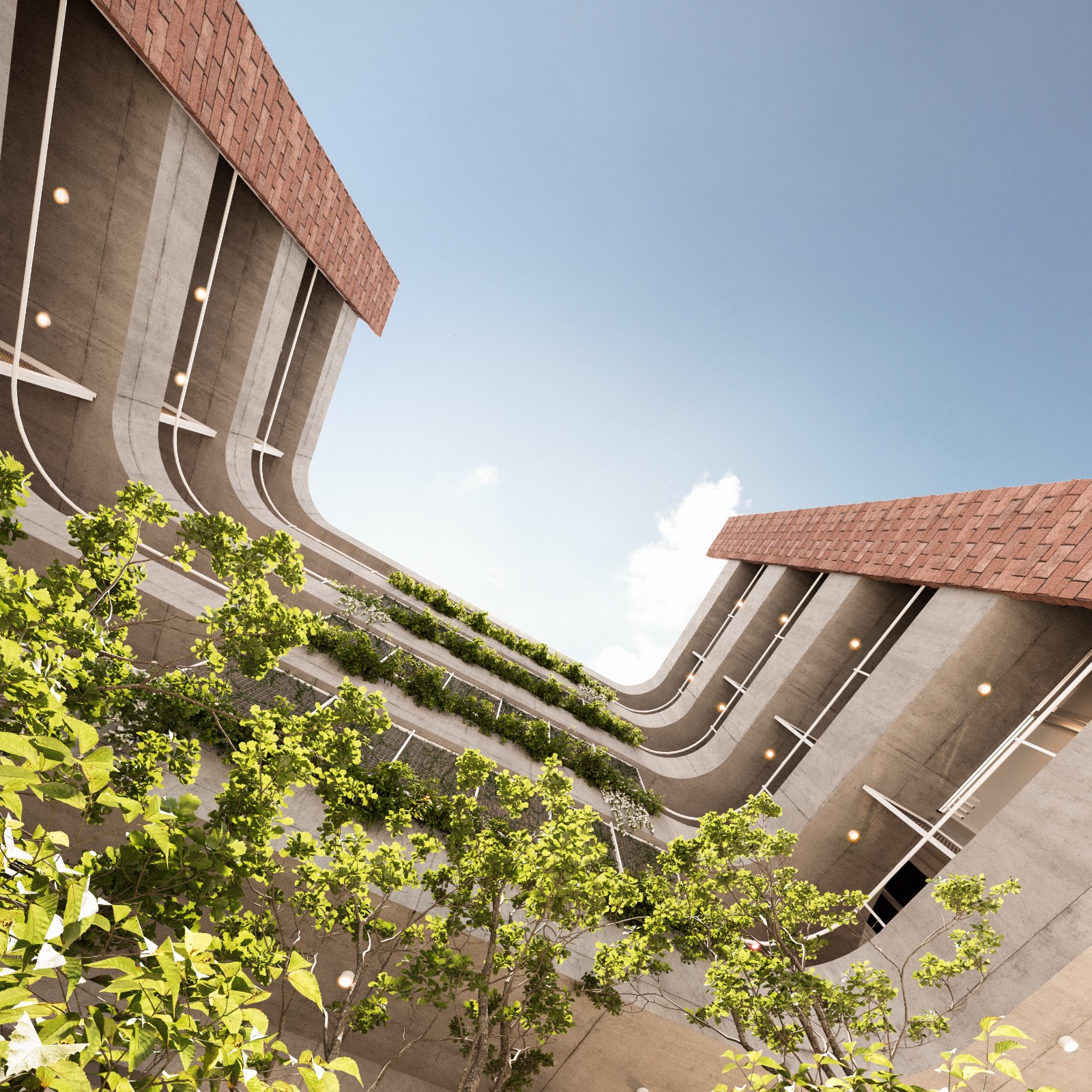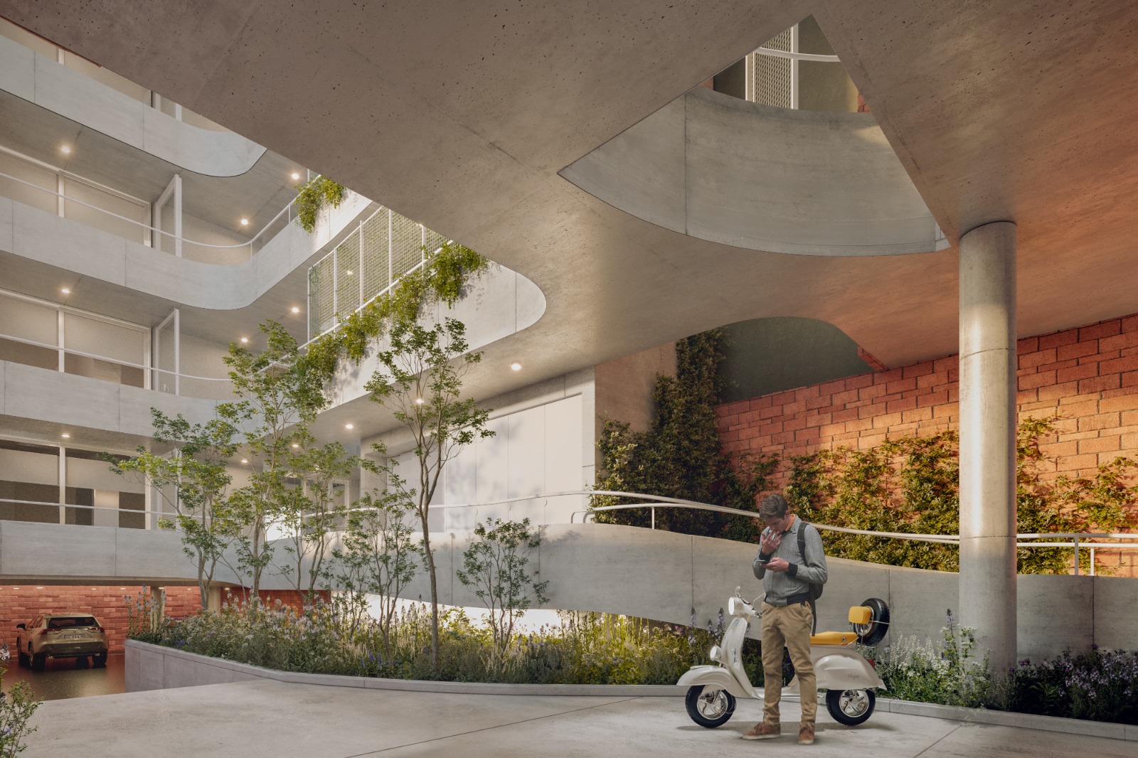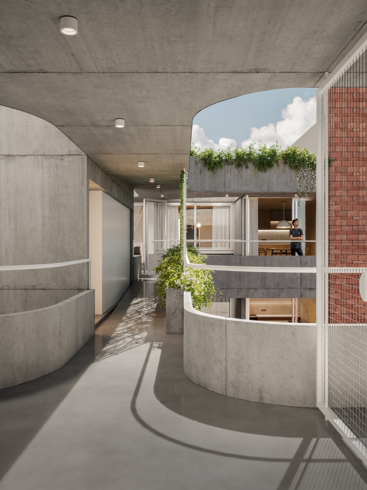 Los palieres de acceso a los departamentos son diseñados como pasarelas abiertas al patio central y poseen canteros con vegetación.