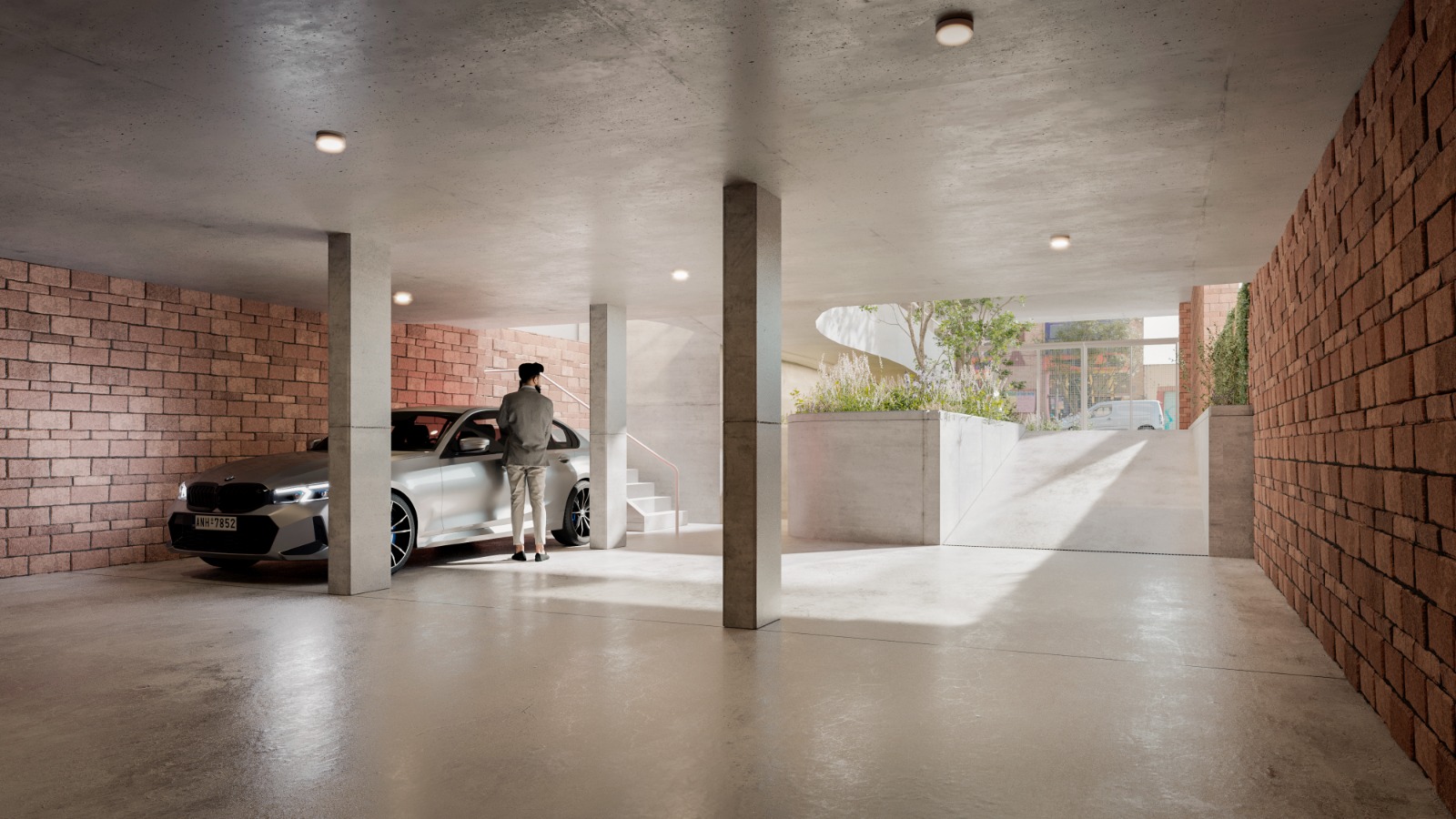Semi-subsuelo para cocheras con acceso por rampa fija.