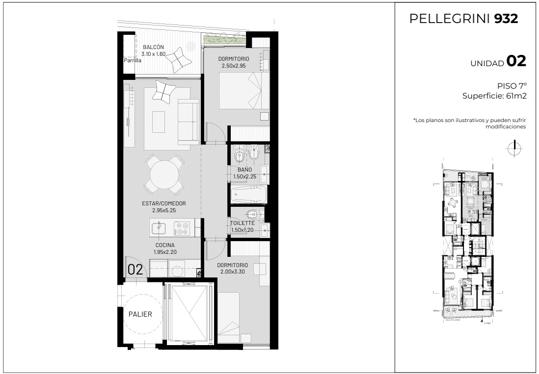 El departamento está compuesto por estar - comedor con cocina integrada, dos dormitorios con placares, baño completo y toilette de recepción.