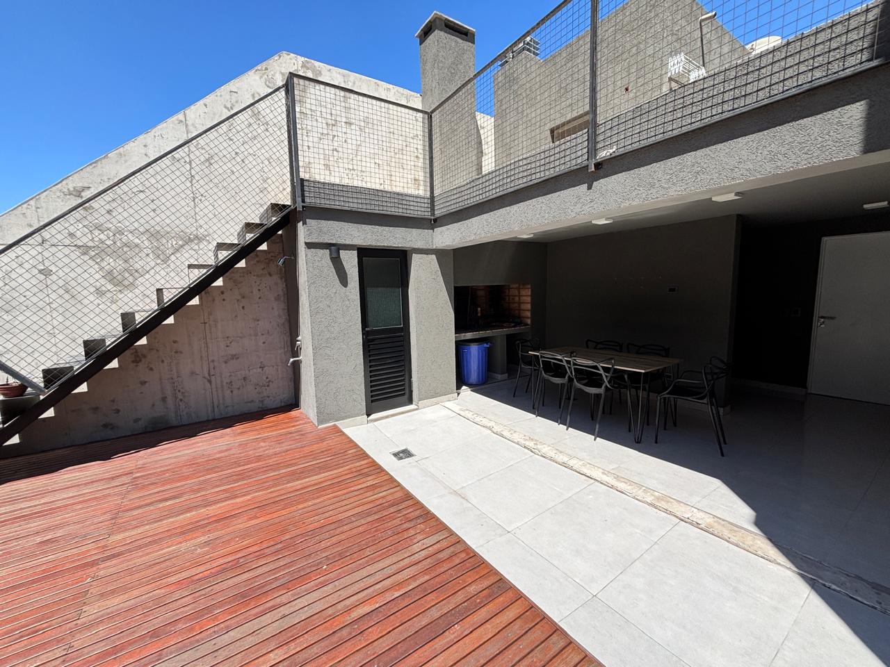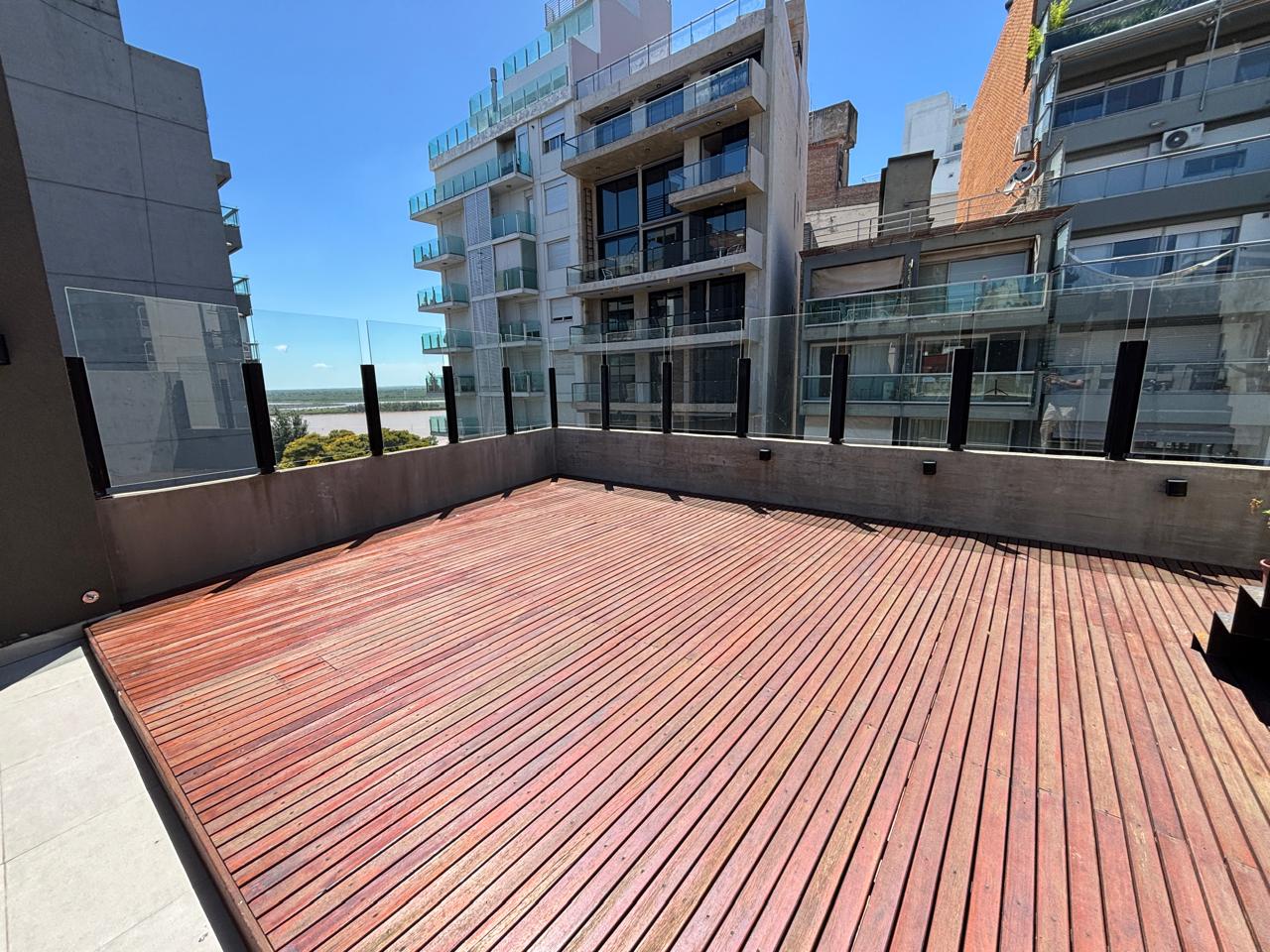 Terraza con vista parcial al río con solarium, parrilla, ducha y baño.
