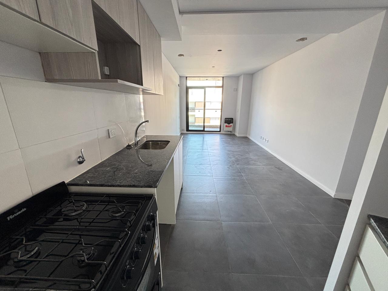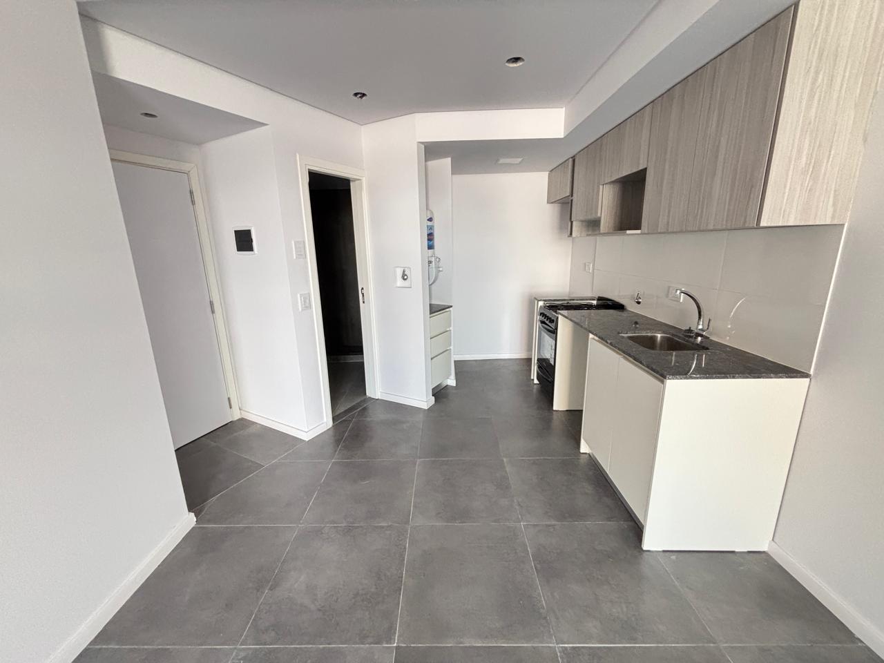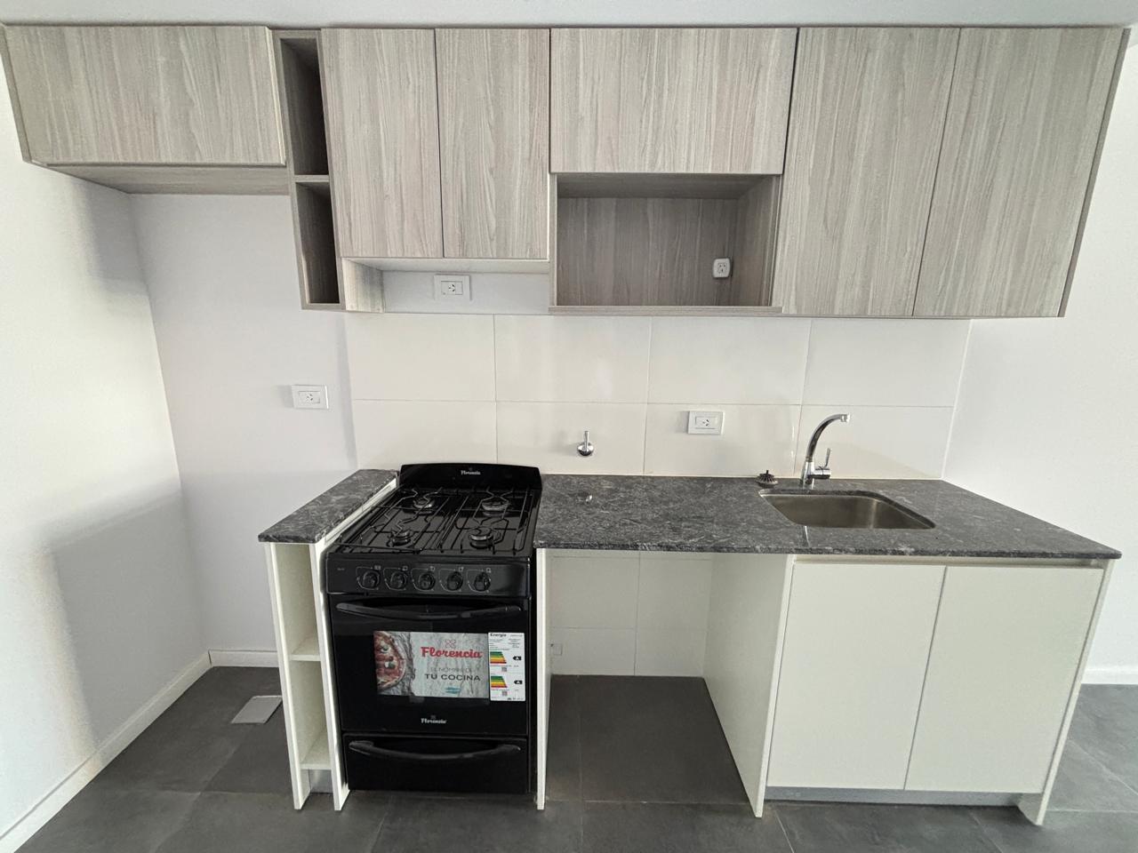 Departamentos de un ambiente con cocina integrada (con buen espacio de guardado tanto en alacenas como bajo mesadas) y baño con habitáculo.