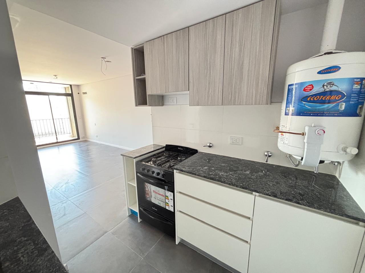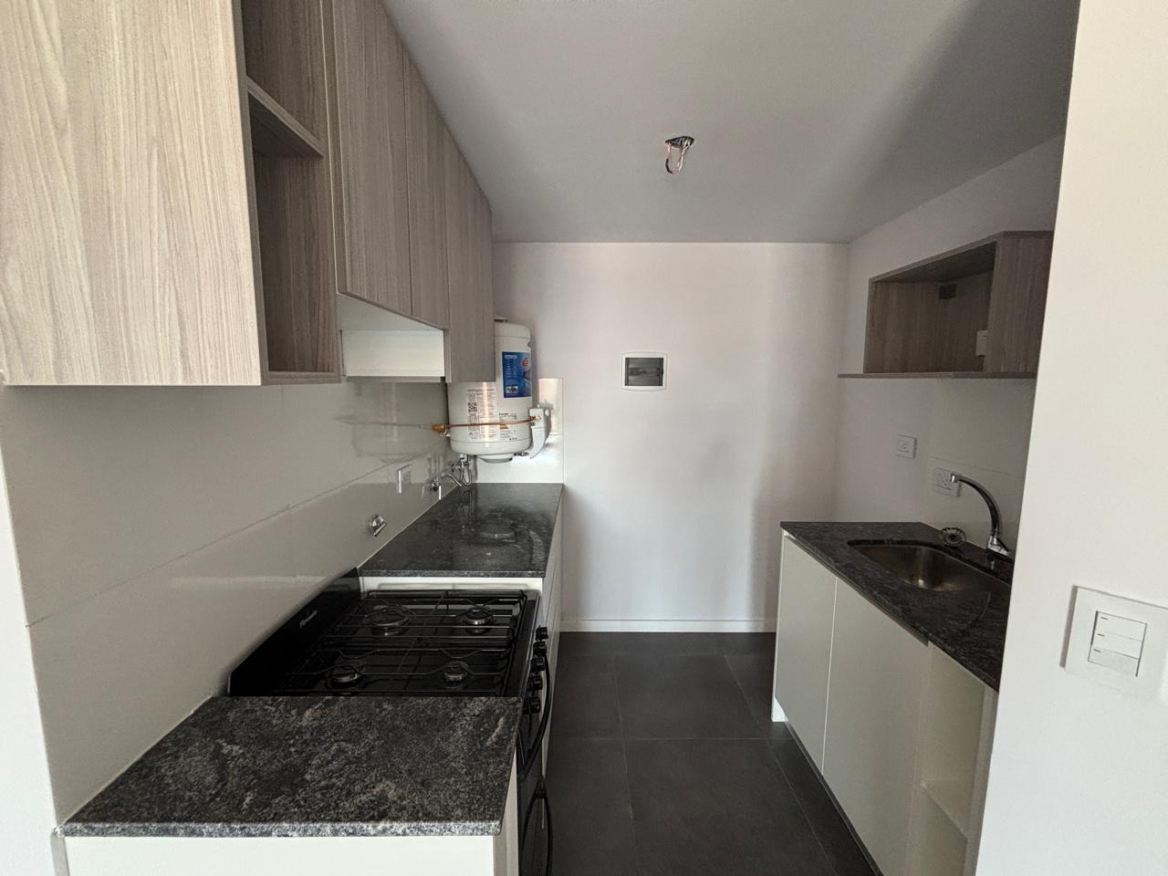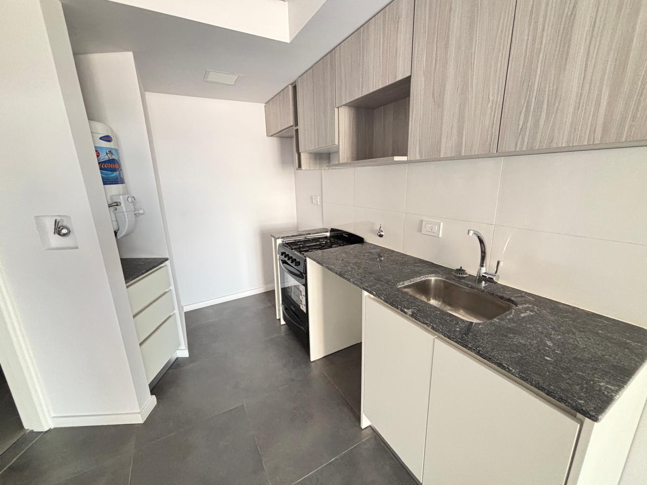 Departamentos de un ambiente con cocina integrada (con buen espacio de guardado tanto en alacenas como bajo mesadas) y baño con habitáculo.