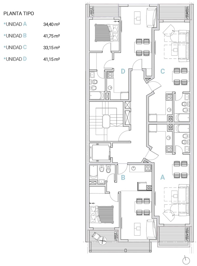 Edificio de PB + 10 pisos con unidades de un ambiente y 1 dormitorio.