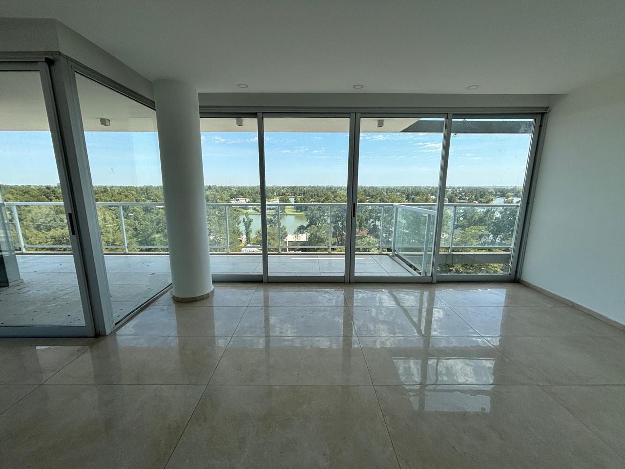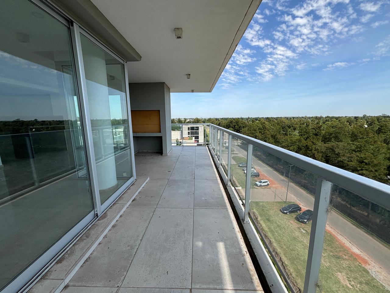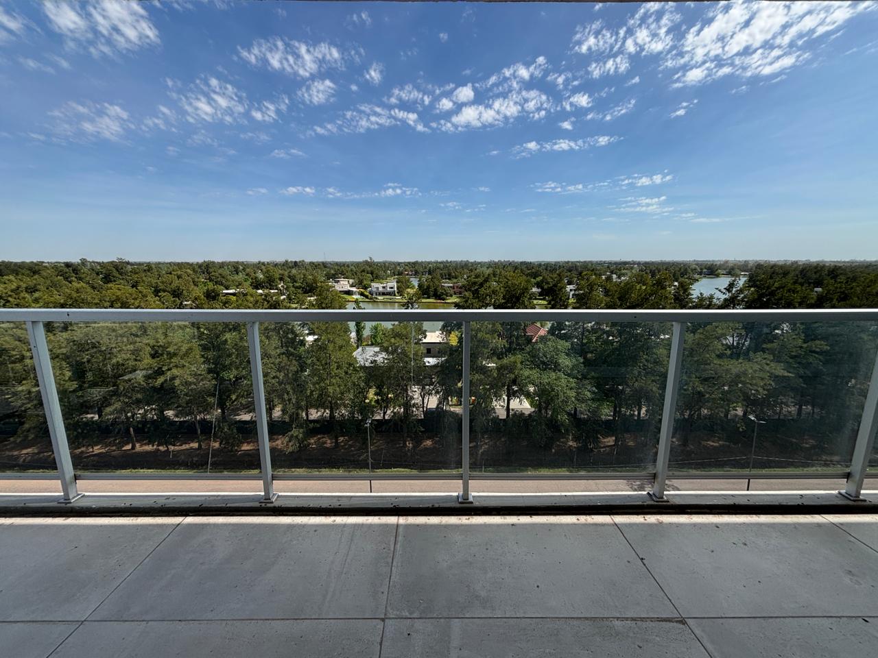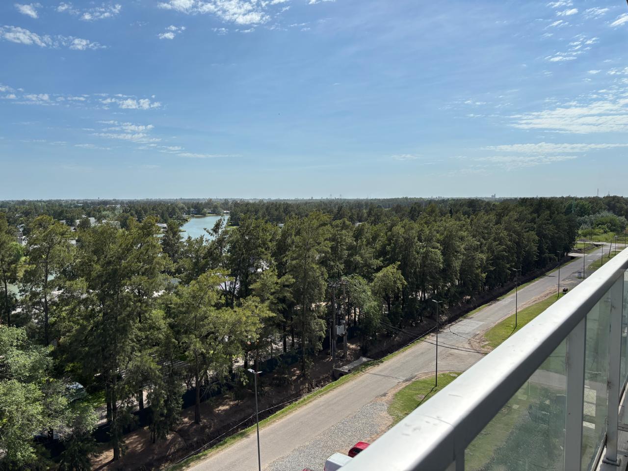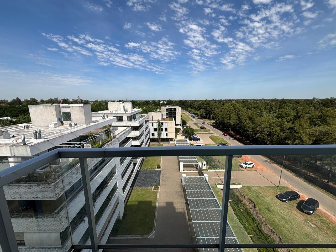 Departamento semipiso, externo con amplio balcón con parrillero orientado al Norte. Vista completamente despejada mirando al barrio cerrado Aldea Lago.