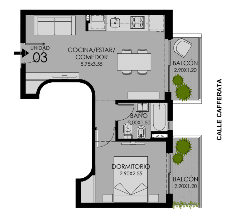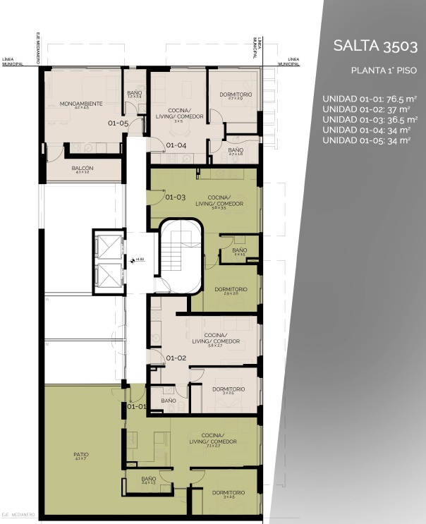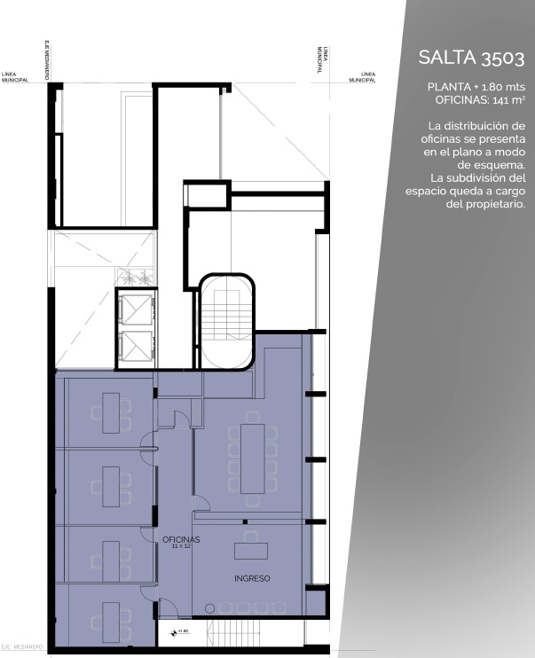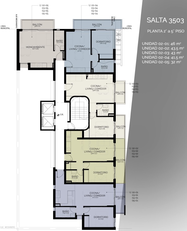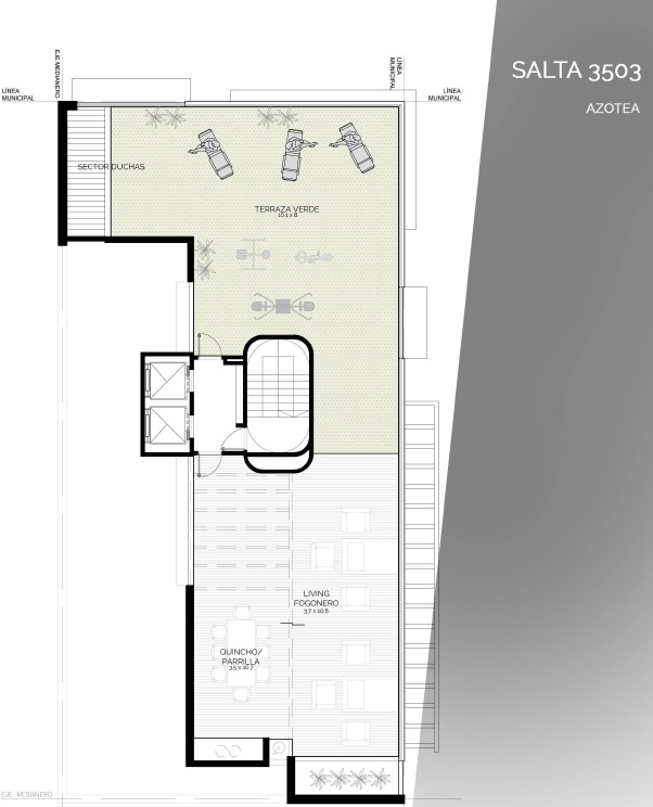 Edificio desarrollado en subsuelo, planta baja y diez pisos con terraza accesible. Compuesto por espacio para estacionar, local comercial, oficinas y 45 departamentos. Entre ellos se encuentran unidades de un dormitorio, dos dormitorios y unidades monoambientes. La terraza de 200 m2 se compone de solárium, duchas, sector aeróbico, living fogonero y parrillero.