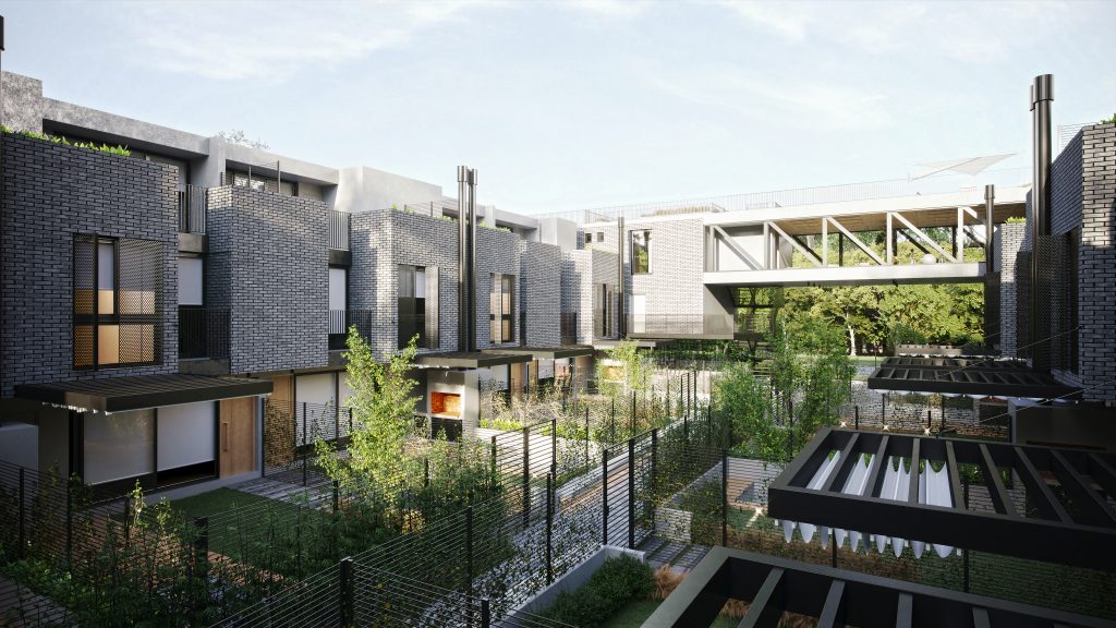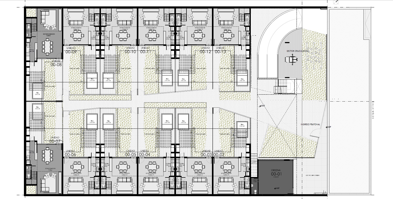 Complejo de 12 casas con unidades de 2 y 3 dormitorios + comodín en la última planta (dormitorio, escritorio, playroom), todas con jardín, parrilla y pileta. 3 departamentos tipo dúplex al frente con vista a la plaza, de 2 dormitorios con terrazas exclusivas.