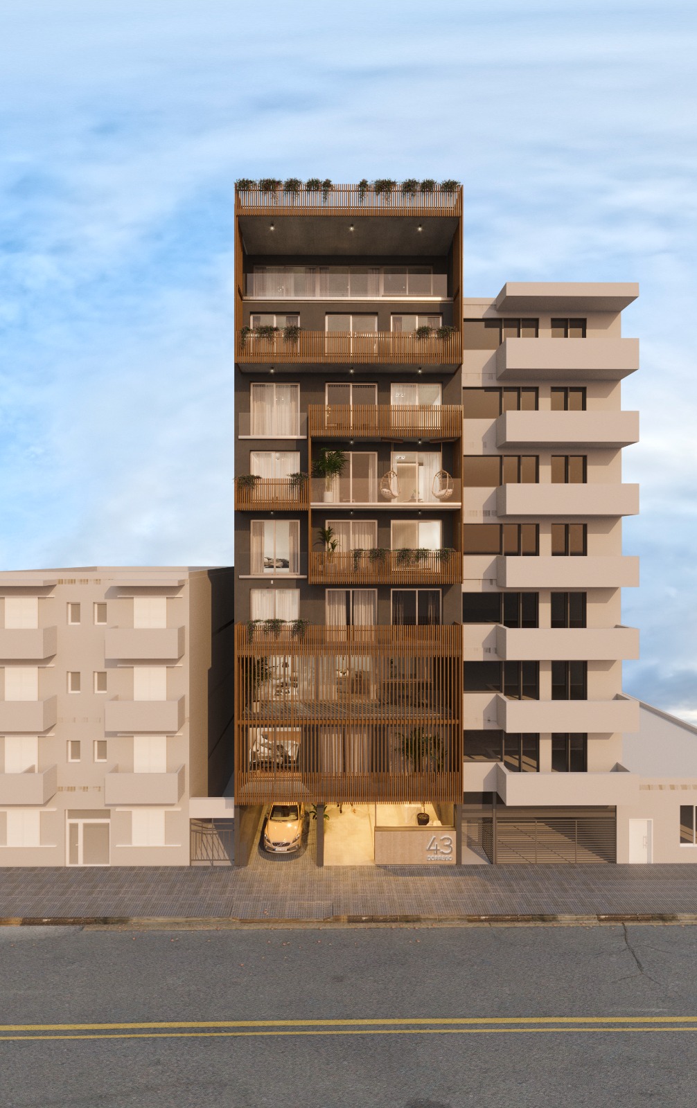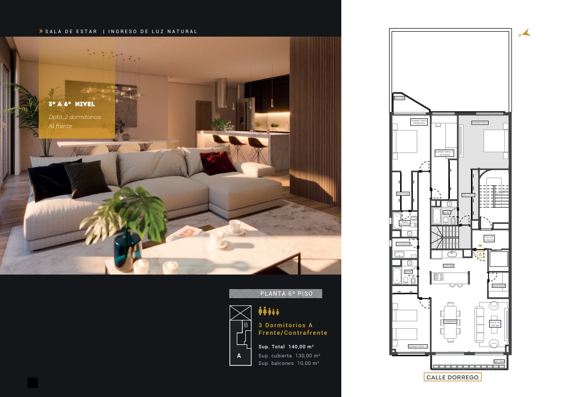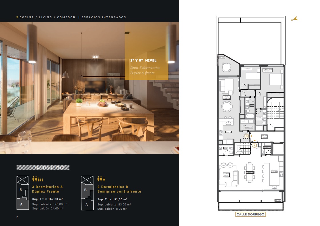 Se desarrollan tipologías de departamentos de 2 y 3 dormitorios, 1 y 2 dormitorios en dúplex, 3 dormitorios en dúplex uno de ellos con terraza de uso exclusivo.