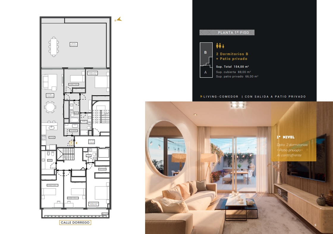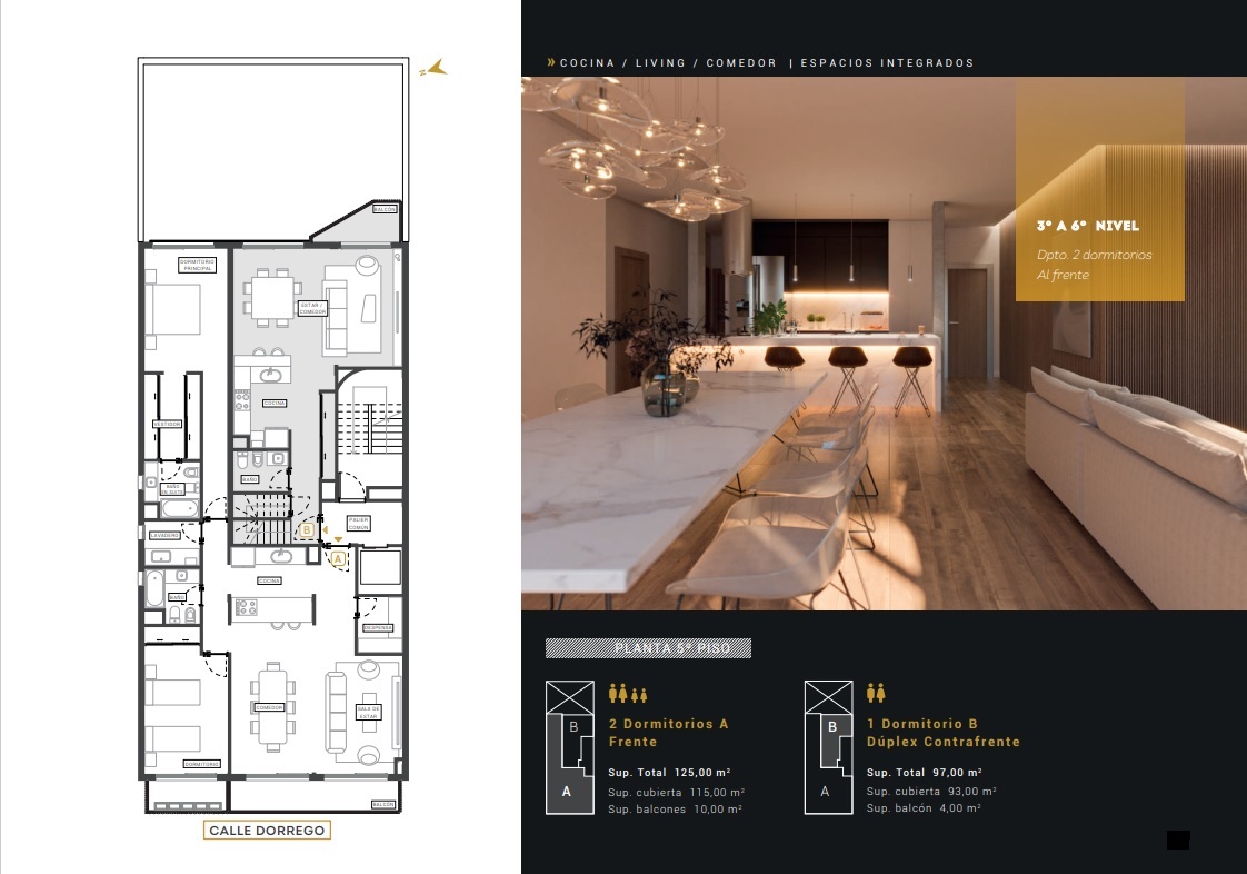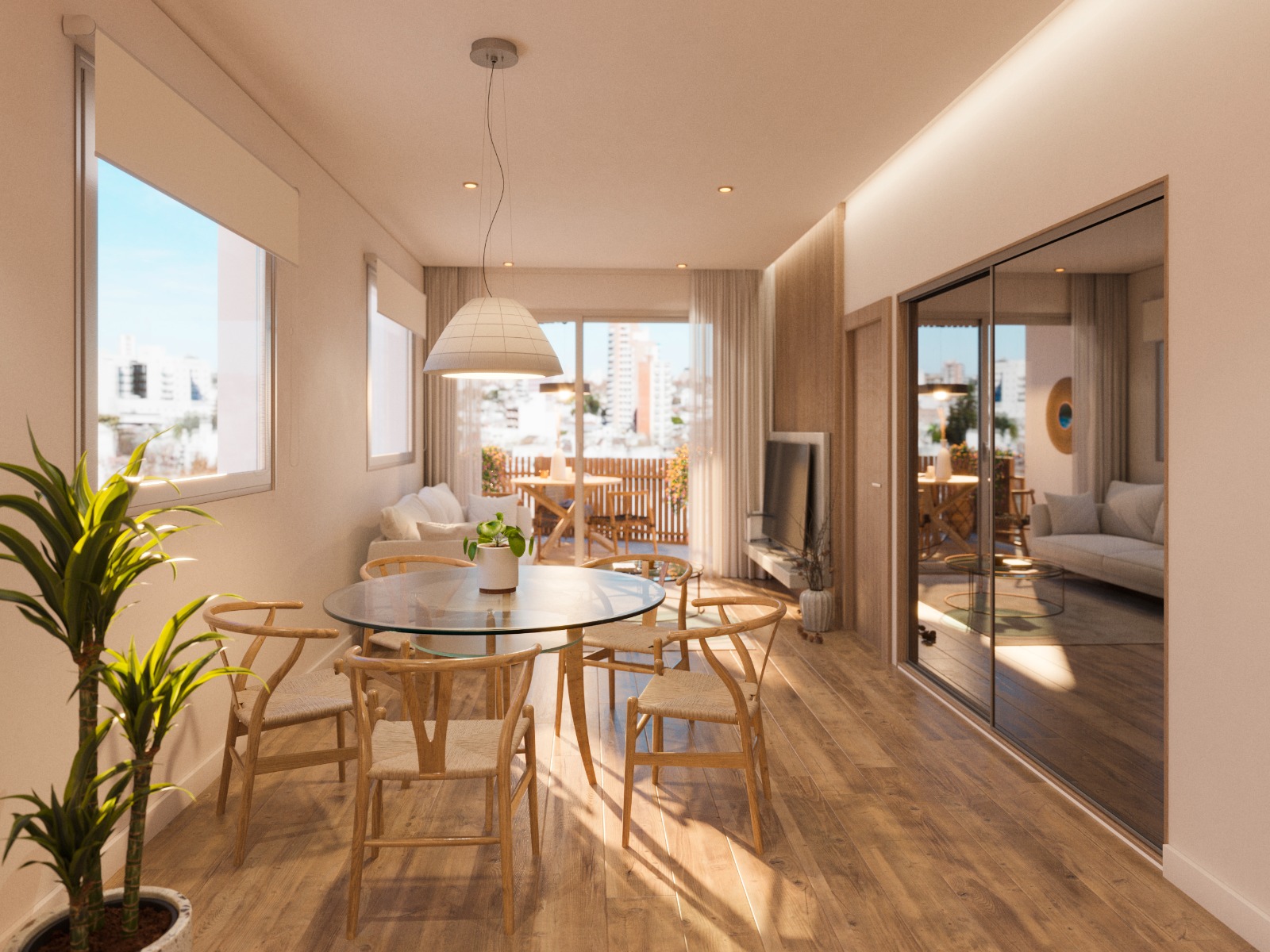 La única unidad de 1 dormitorio tipo dúplex se encuentra en el piso 5 y 6 al contrafrente. En la planta inferior se desarrolla estar - comedor con salida al balcón, cocina semi