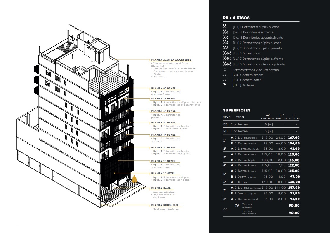 El proyecto se compone de un nivel de subsuelo, planta baja, 8 niveles de viviendas y un nivel de terrazas.