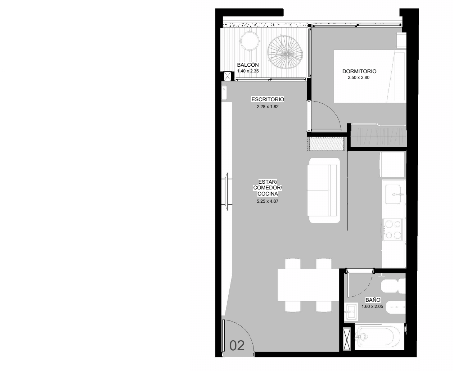 Departemento de 1 dormitorio con balcón al frente, orientación Norte.