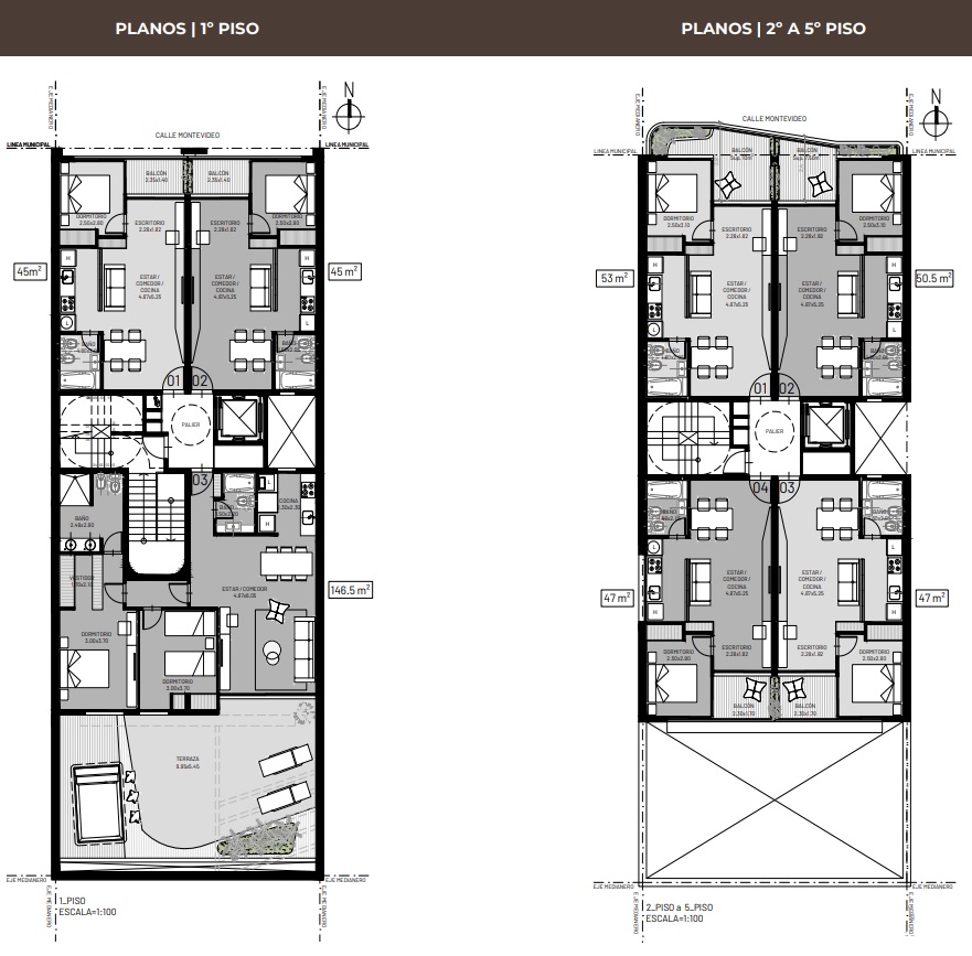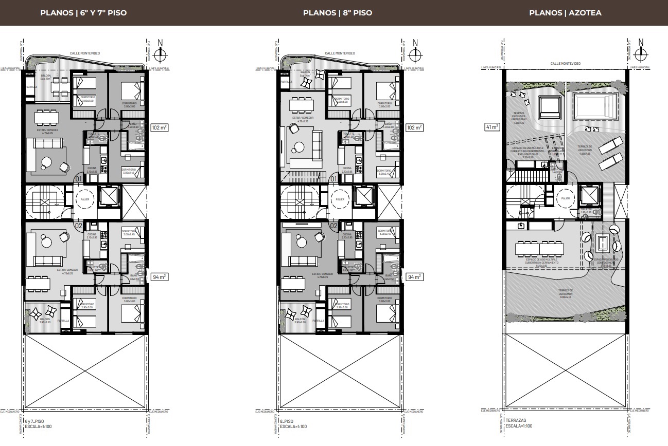 Departamentos de 3 dormitorios con orientación al frente Norte o al contrafrente Sur.
